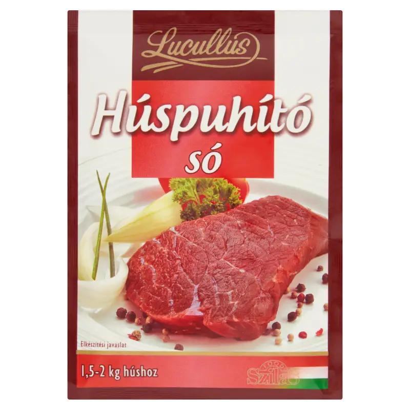 Сіль для розм’якшення м’яса Lucullus містить рослинний фермент папаїн, який сприяє розпушенню м’ясних волокон. Розподіліть сіль Meat Tenderizer рівномірно по поверхні підготовленого м’яса, а потім дайте йому постояти дві години. Перед запіканням або грилем приправте м'ясо за смаком, додаючи кухонну сіль, зверніть увагу на те, що продукт також містить сіль. Під час приготування м’яса дійте, як зазвичай.