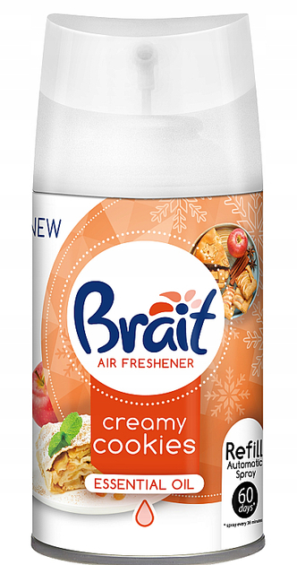 Освіжувач,Освіжувач повітря,Освіжувач повітря Brait,Освіжувач повітря Brait Creamy Cookies автоматичний із змінним балоном з ароматом випічки 250мл,Освіжувач, Освіжувач повітря, Освіжувач повітря Brait, Освіжувач повітря Brait Creamy Cookies автоматичний із змінним балоном з ароматом випічки 250мл,Brait,Польша,Змінний балон для автоматичного ароматизатора повітря Brait Creamy Cookies з ароматом випічки 250мл