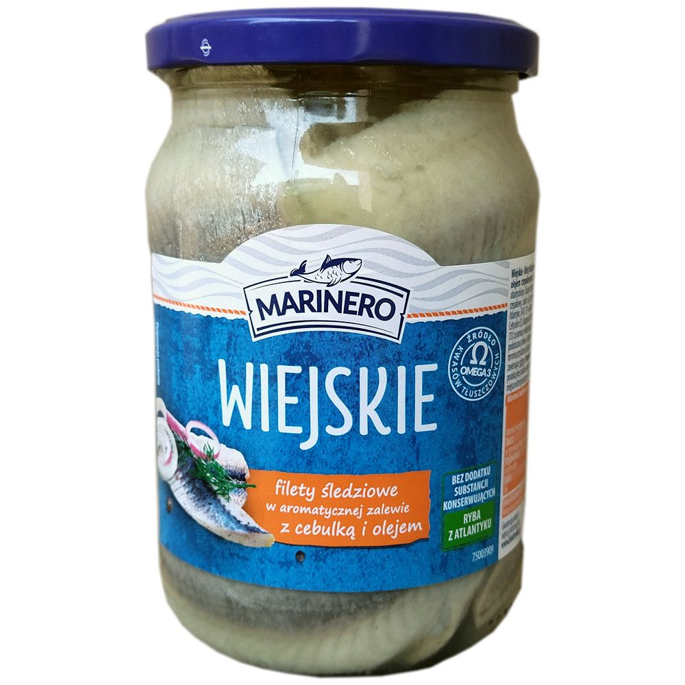 Філе оселедця з цибулею в скляній банці Marinero 600г. Розрізане поздовж філе Оселедеця з цибулею в олії. За смачним рецептом по-домашньому.