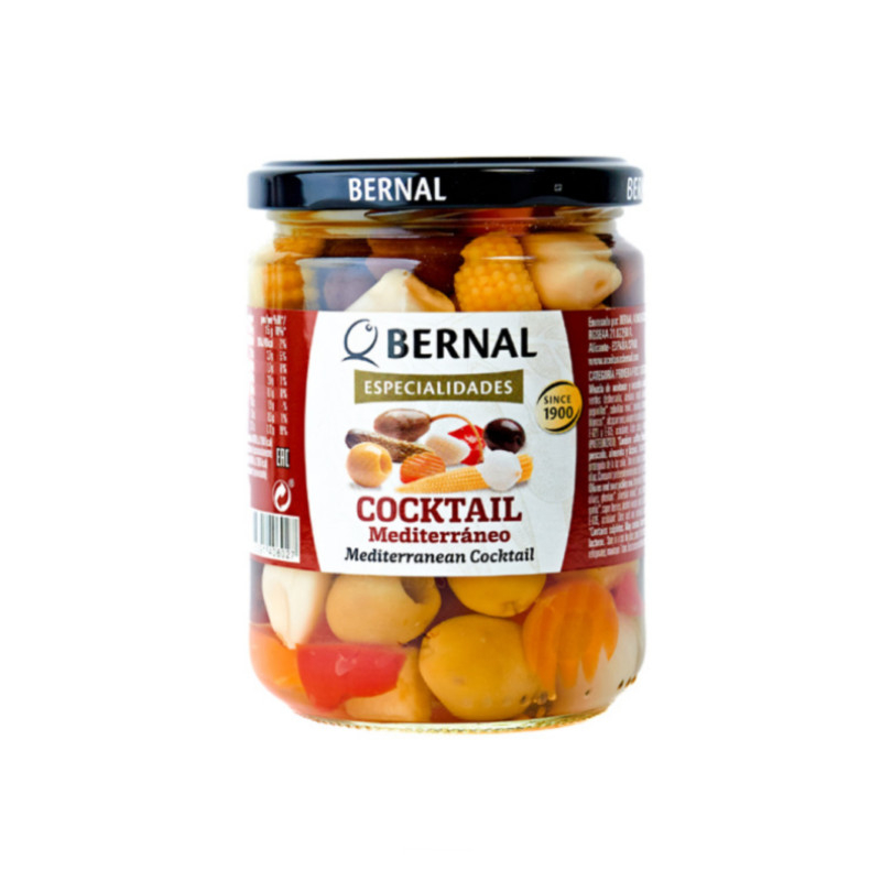 Середземноморський коктейльний мікс Bernal Mediterranean Cocktail - Суміш оливок і різних солінь, що містить до 10 різних овочів, таких як: солоні огірки, королівська цибуля, морква, тапенас і тапенон (каперси) з розділеними зеленими оливками, оливки севільські, арагонські оливки, оливки кукільйо і оливки мансанільї, фаршировані перцем, початки кукурудзи.