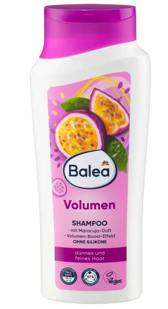 Шампунь для надання об'єму Balea з ароматом плодів Маракуйя 300 мл. Шампунь для збільшення об'єму. Без силіконів, без алкоголю. Пройшов клінічні випробування по сумісності з шкірою голови. Надає волоссю об'єм і зміцнює структуру аж до кінчиків, що не обтяжуючи волосся. М'яка формула живить волосся завдяки комплексу з вітаміном B3 і провітаміном B5.