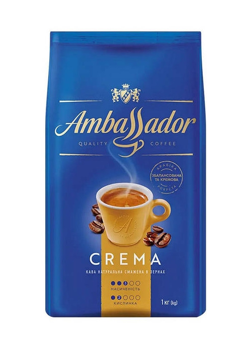Ambassador Crema – той самий справжній еспресо, натуральна Кава смажена з зернах, смак якого є найкращим прикрасою нового дня. Кавовий напій виходить густий і щільний, насичений, що володіє чарівним післясмаком з легкою кислинкою і яскравим ароматом з кофейно-винними відтінками.