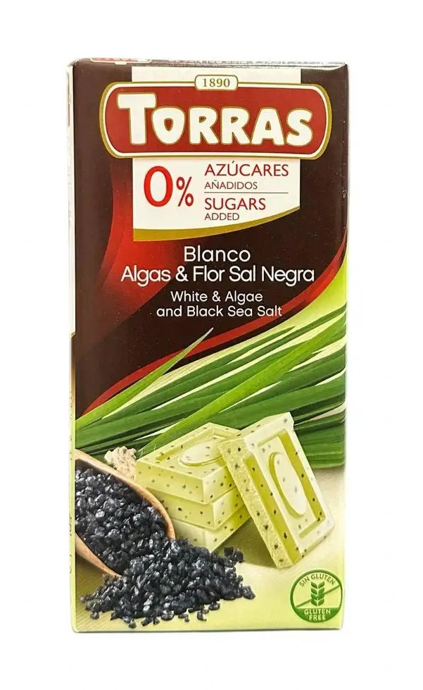 Шоколад Білий без Глютену Torras Blanco Algas&Flor Sal Negra Chocolate 0%Sugar Торас Водорості та Чорна морська сіль Плитка 75г