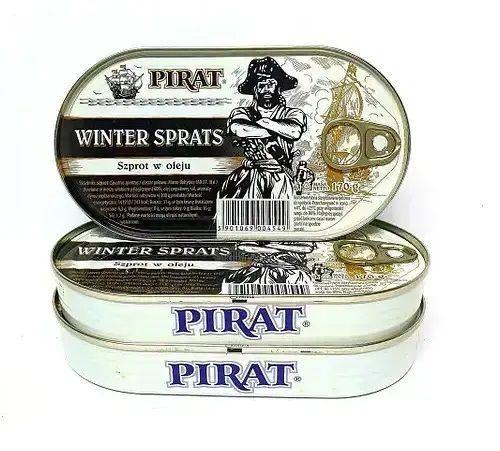 Pirat Szprot - це ніжні копчені рибки без голів, приправлені соусом з на основі рослинної олії з спеціями. Шпроти традиційно виготовляють з балтійської кільки (європейського шпрота)
