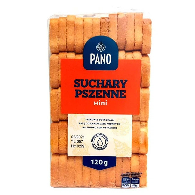 Сухарики Pano suchary pszenne mini (міні сухарики Пано) 120г (Хлібці білі сушені з пшеничного борошна) для бутербродів та канапок — повітряні сушені грінки, чудово підходять для багатьох видів канапе: Канапе із сиром, канапе «люсіль», канапе з пюре курчати, канапе з мідіями.